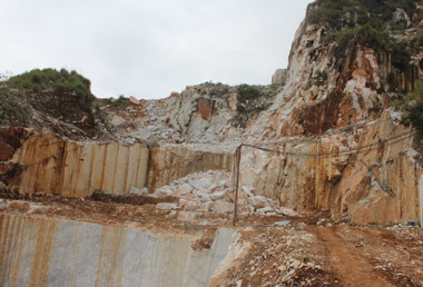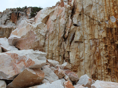 圖3結(jié)構(gòu)完整的大理石礦,被工人在山上就地切成塊狀,運到山下通過圓盤鋸的切割,制成天然大理石板材。