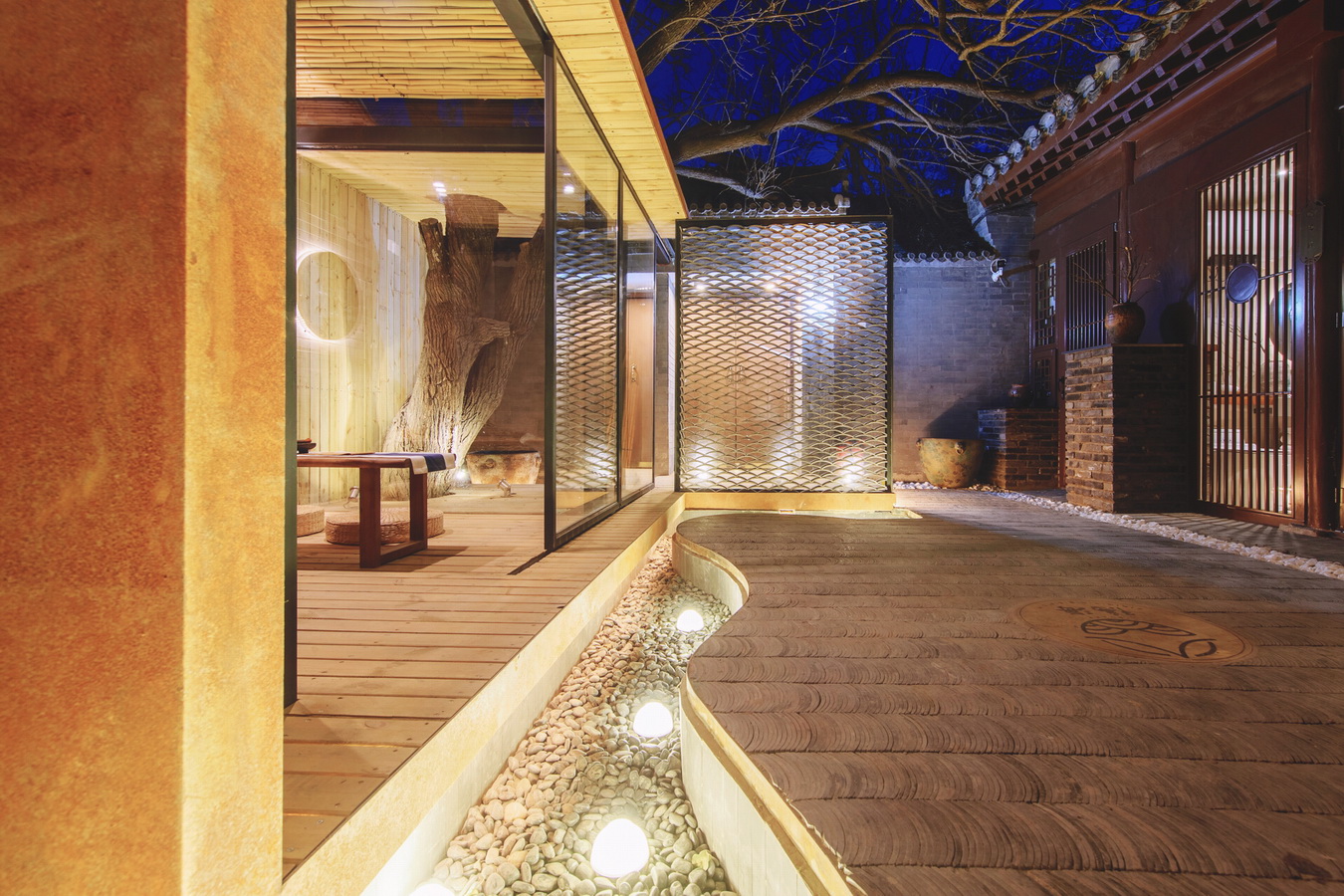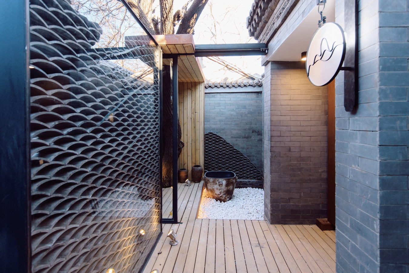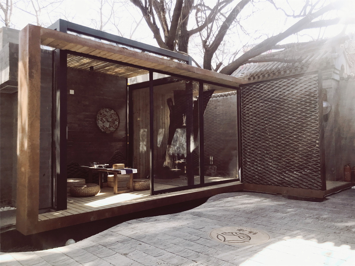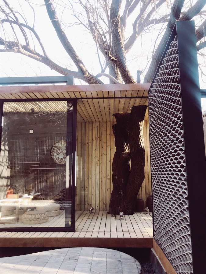 小院中大樹與茶室的媾和形成全院的核心,通過一個(gè)連續(xù)轉(zhuǎn)折的形體將入口、茶室與大樹等要素整合在一起,形成玄關(guān)、東南角樹院和茶室空間,選擇銹蝕鋼板和防腐木板兩種本身帶有時(shí)間沉淀感的材料與建筑主體在色彩與氣氛上相契合,是新與舊的融合,并以一個(gè)透明與儀式性的姿態(tài)言說了一種不同于西方街道廣場(chǎng)式的「庭院公共生活」:一種以親近自然為主旨的公共生活。