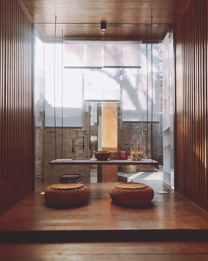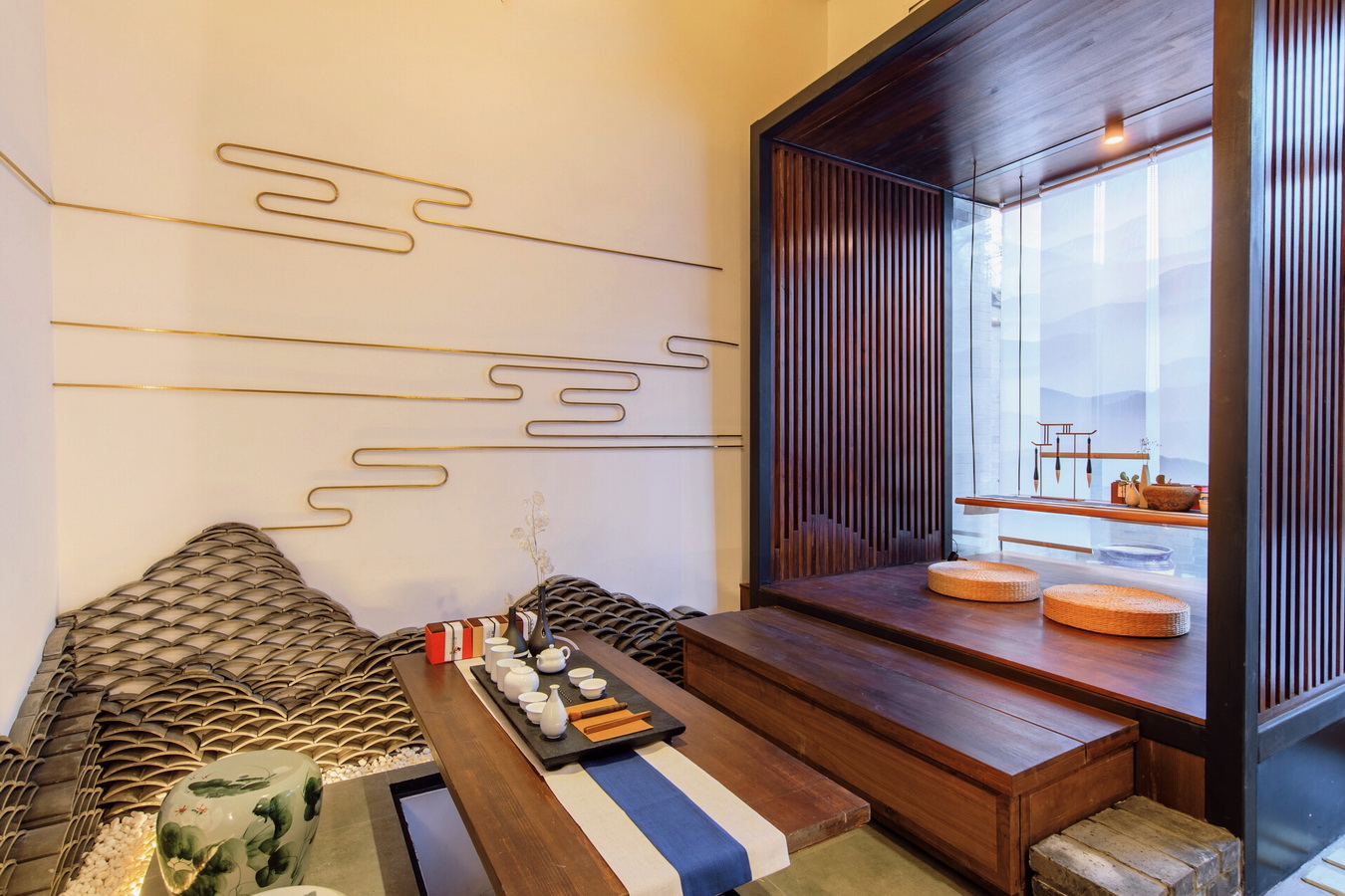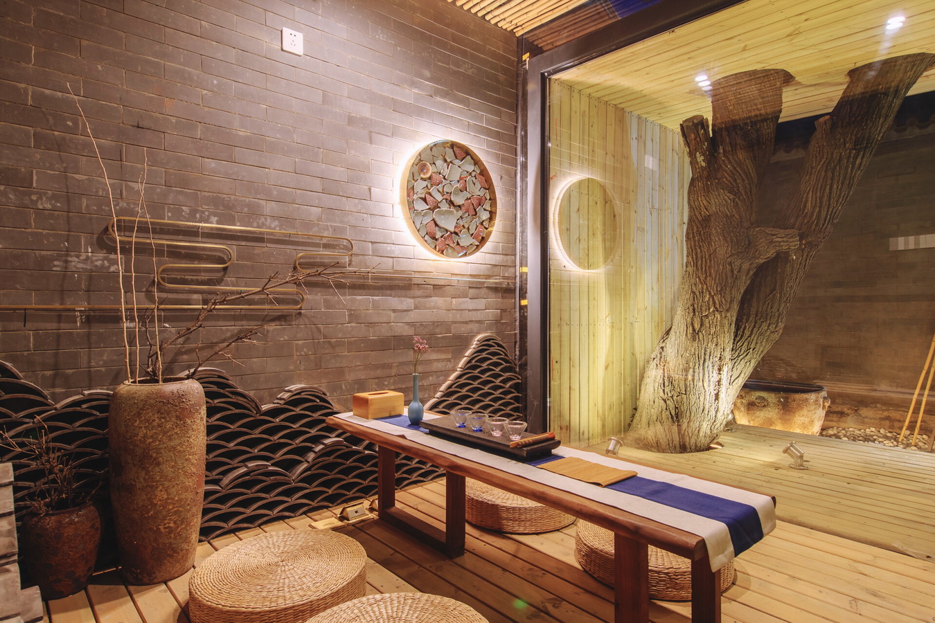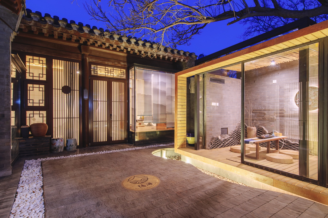 小院中大樹與茶室的媾和形成全院的核心,通過一個(gè)連續(xù)轉(zhuǎn)折的形體將入口、茶室與大樹等要素整合在一起,形成玄關(guān)、東南角樹院和茶室空間,選擇銹蝕鋼板和防腐木板兩種本身帶有時(shí)間沉淀感的材料與建筑主體在色彩與氣氛上相契合,是新與舊的融合,并以一個(gè)透明與儀式性的姿態(tài)言說了一種不同于西方街道廣場(chǎng)式的「庭院公共生活」:一種以親近自然為主旨的公共生活。