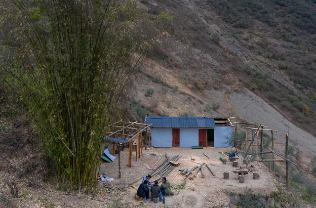 12月23日,某色蘇不惹(右)和同伴在懸崖村蓋樹脂瓦做的民宿。