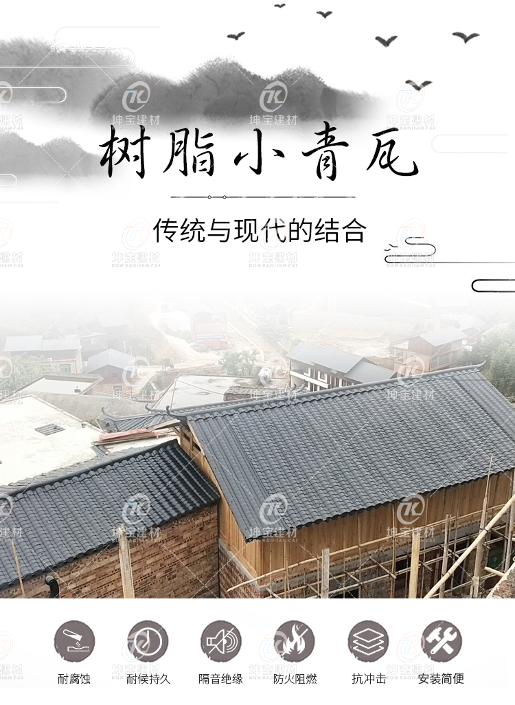 樹(shù)脂小青瓦,高仿傳統(tǒng)土瓦形狀,延續(xù)“鱗次櫛比”的傳統(tǒng)屋面文化,是農(nóng)村土坯房、祖屋青瓦的替代品,既保持了中華傳統(tǒng)屋面特色,又解決了不易被貓、老鼠爬開(kāi)導(dǎo)致土瓦漏水的現(xiàn)象。